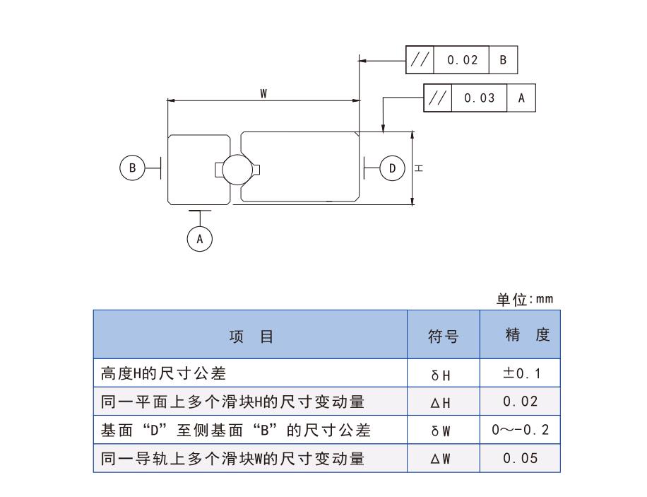 一套導軌副由具有V形溝槽的導軌2根和滑塊4件組成。滑塊兩端的返向器實現鋼球無限循環,滑塊兩端裝有密封端蓋,將落在導軌上的粉塵等刮去。滑塊體和返向器上設置有排塵槽,能有效地防止粉塵或木屑堵塞,保證滑塊正常運行。
